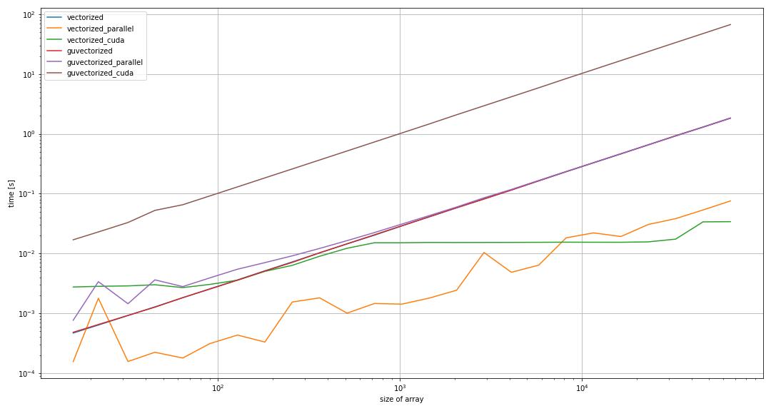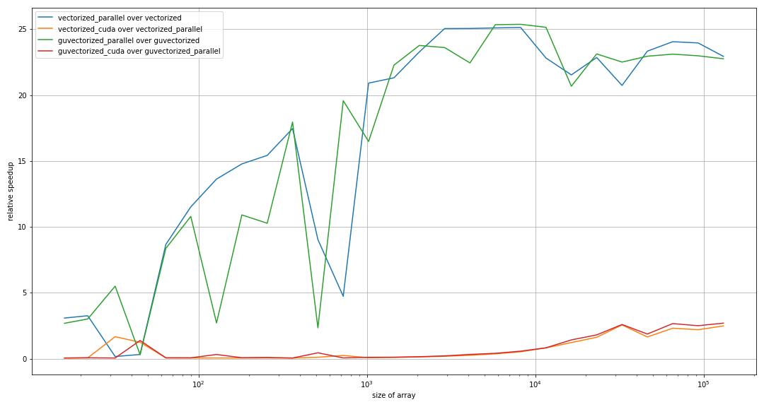 On the vectorize size, stuff is as expected: For sufficiently large input arrays, I can saturate all my cores with target parallel. Performance scales accordingly. cuda is yet a little faster than all the CPU cores, again as expected.